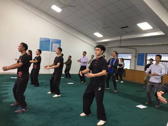 教学现场,吕老师通过理论和实践相结合的形式对“八段锦”进行了教学。他简洁地介绍了“八段锦”的由来和要领,让大家领略传统文化的魅力精髓。“八段锦”是古人创编的八节不同动作组成的一套医疗、康复体操,八组动作使得人身体的所有部位都得到了锻炼,对身体而言有很好的保健作用,同时也能治疗相关疾病。伴着舒缓的音乐,吕老师为大家展示了优美的“八段锦”全教程,并对“八段锦”动作要领进行了认真、细致指导。大家认真聆听,积极练习,较好地掌握了基础动作。