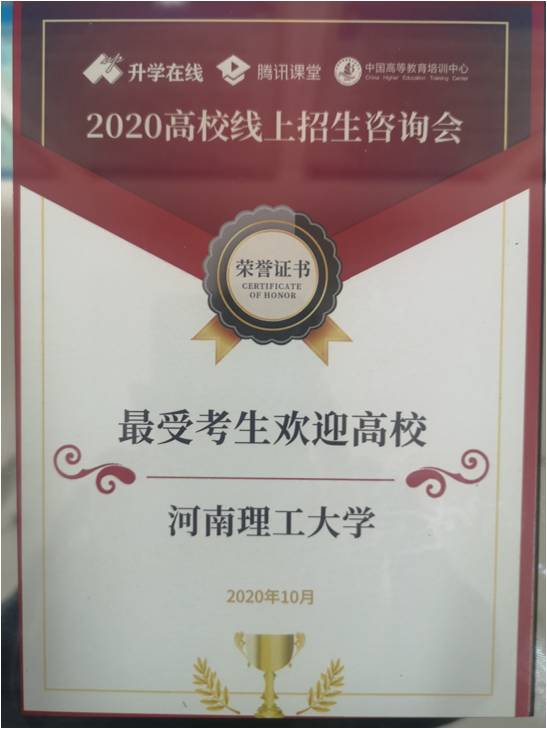 近日,我校荣获由升学在线、腾讯课堂、中国高等教育培训中心主办的“2020高校线上招生咨询会最受考生欢迎高校”的荣誉称号。