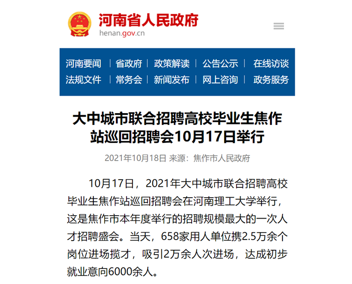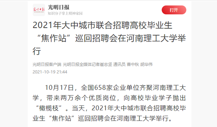 10月17日,2021年大中城市联合招聘高校毕业生“焦作站”巡回招聘会在河南理工大学举行。《光明日报》客户端、河南省人民政府门户网站、《河南日报》客户端等对此事进行了报道。相关内容如下: