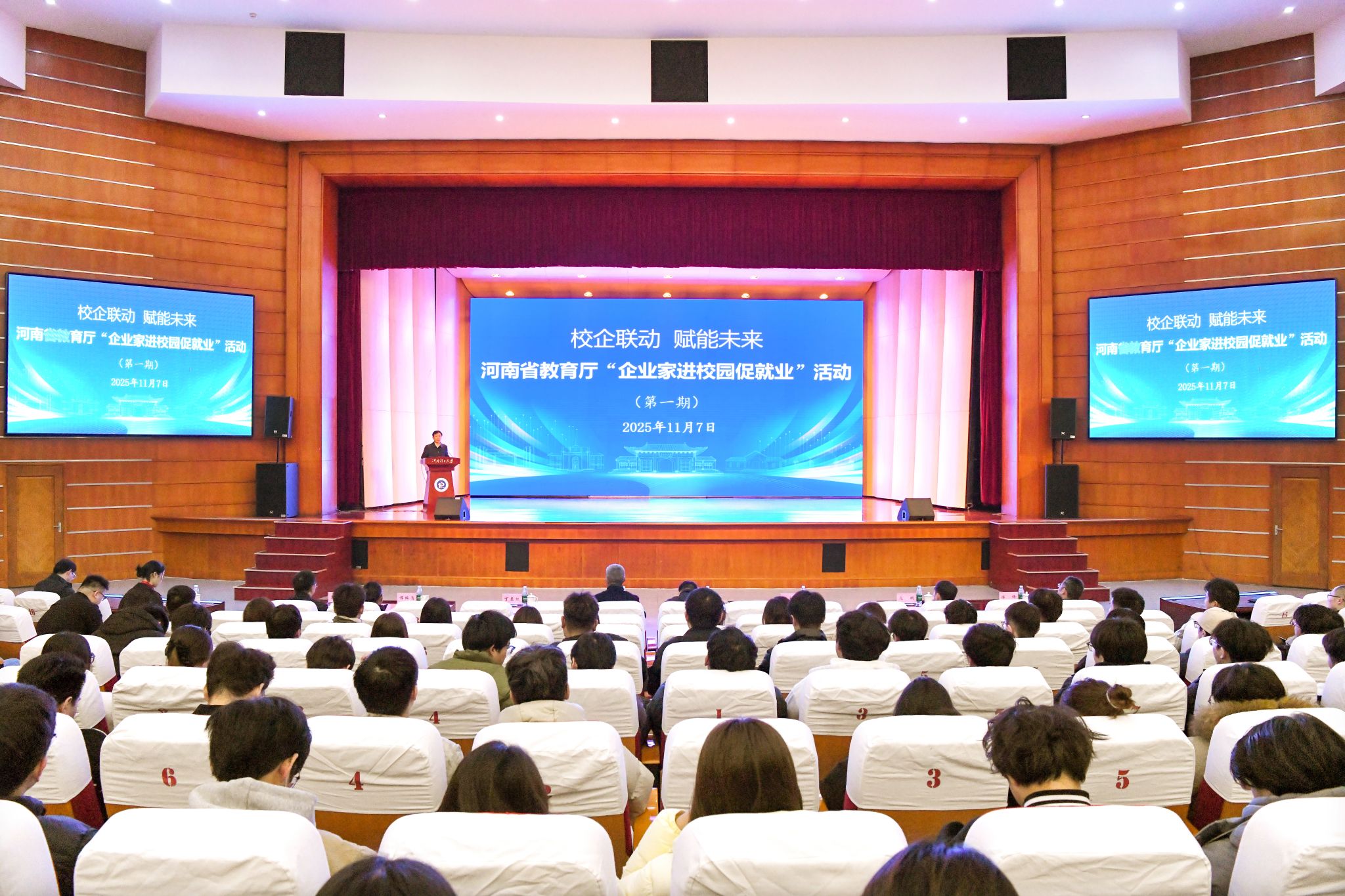 2025年11月7日上午,由河南省教育厅主办、河南省大中专毕业生就业创业促进会承办、河南理工大学协办的“校企联动·赋能未来”——河南省“企业家进校园促就业”系列活动(第一期)在我校南校区明德楼音乐厅举行。学校党委书记刘永涛、河南省教育厅学生工作处处长李班、河南省大中专毕业生就业创业促进会会长岳修峰等领导出席启动仪式。焦作片区高校师生代表600余人参加启动仪式。启动仪式由副校长丁亚红主持。