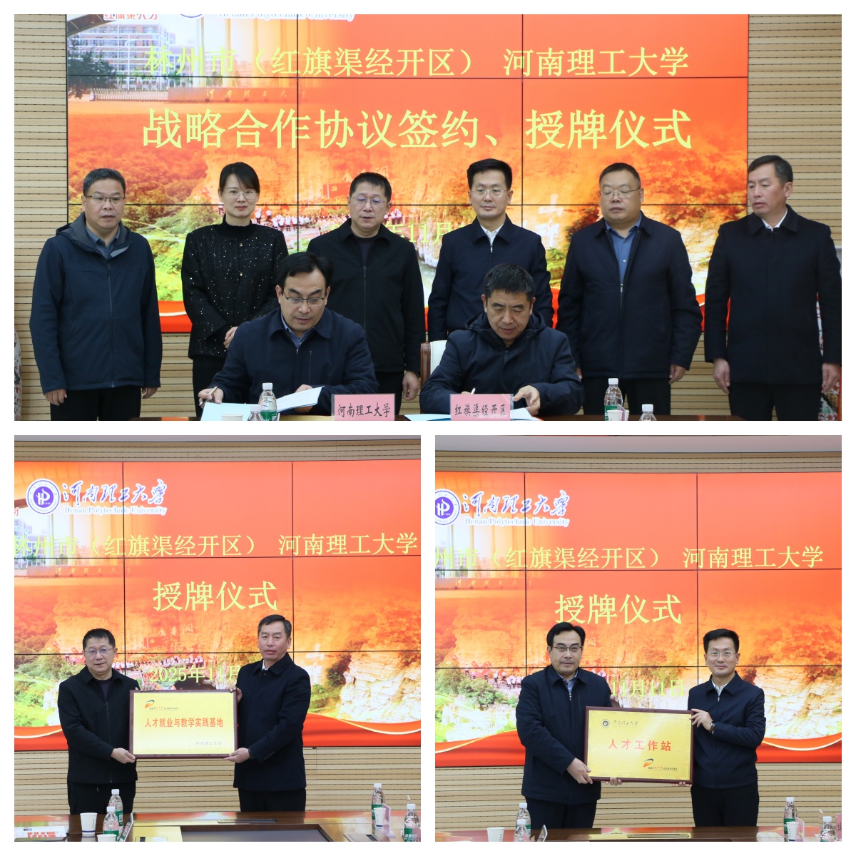 仪式上,许传阳与裴社奇代表双方签署了战略合作协议。刘树伟向学校授“人才工作站”,边亚东向红旗渠经开区管委会授“人才就业与教学实践基地”。