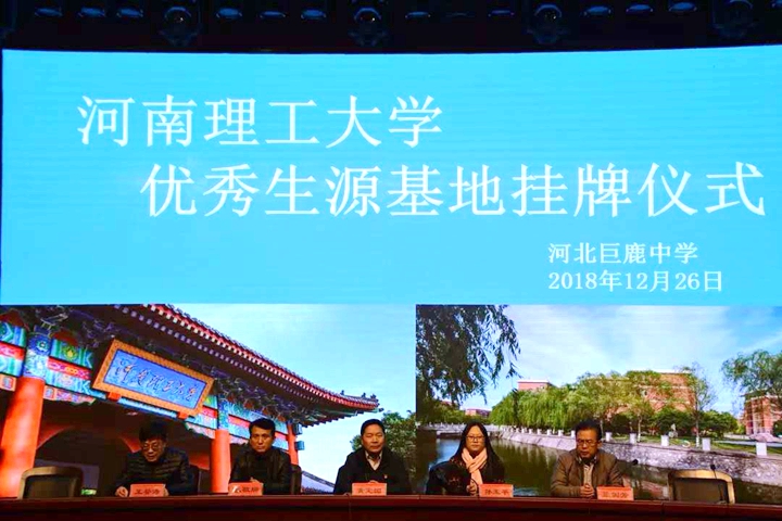 挂牌仪式上,黄定国介绍了我校的办学历程和发展情况,以及历年招生、毕业生就业情况,欢迎巨鹿中学广大考生报考我校。张国芳介绍了巨鹿中学办学理念、发展举措、教学管理、办学成绩。接着,双方在热烈、亲切的气氛中,签订了优质生源基地建设协议书,并为“河南理工大学大学优质生源基地”揭牌。双方还围绕专业设置、招生规模、办学条件、教学咨询、校际交流等问题进行了亲切交谈。