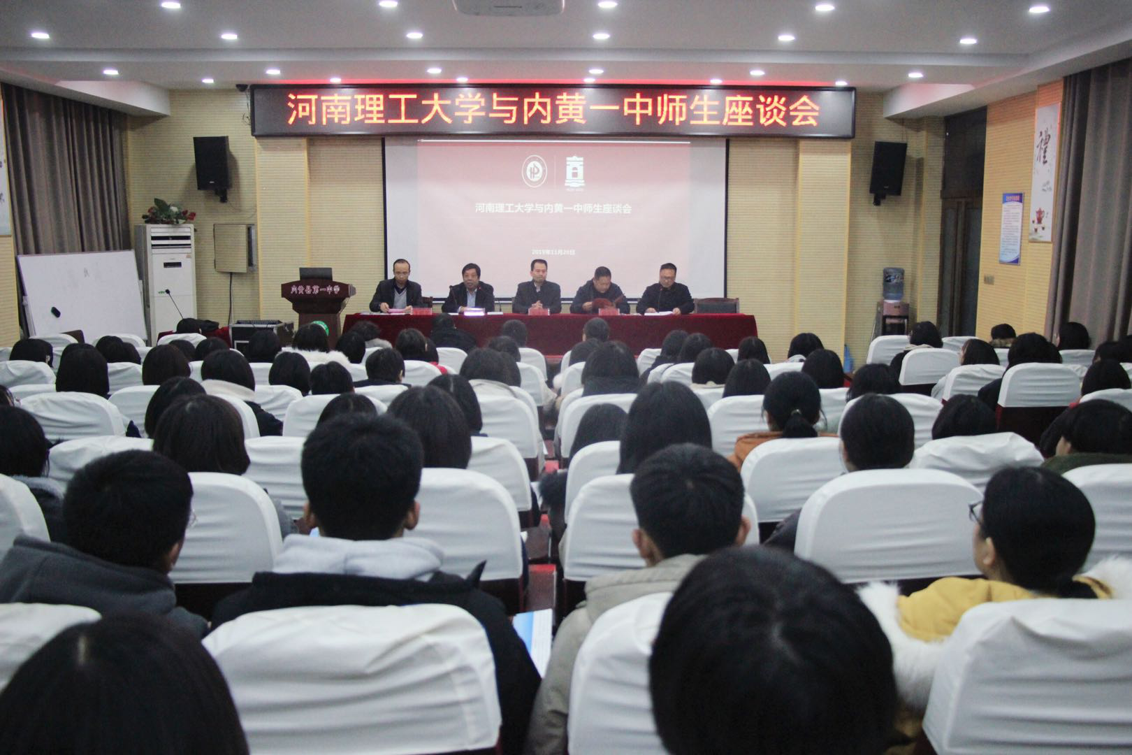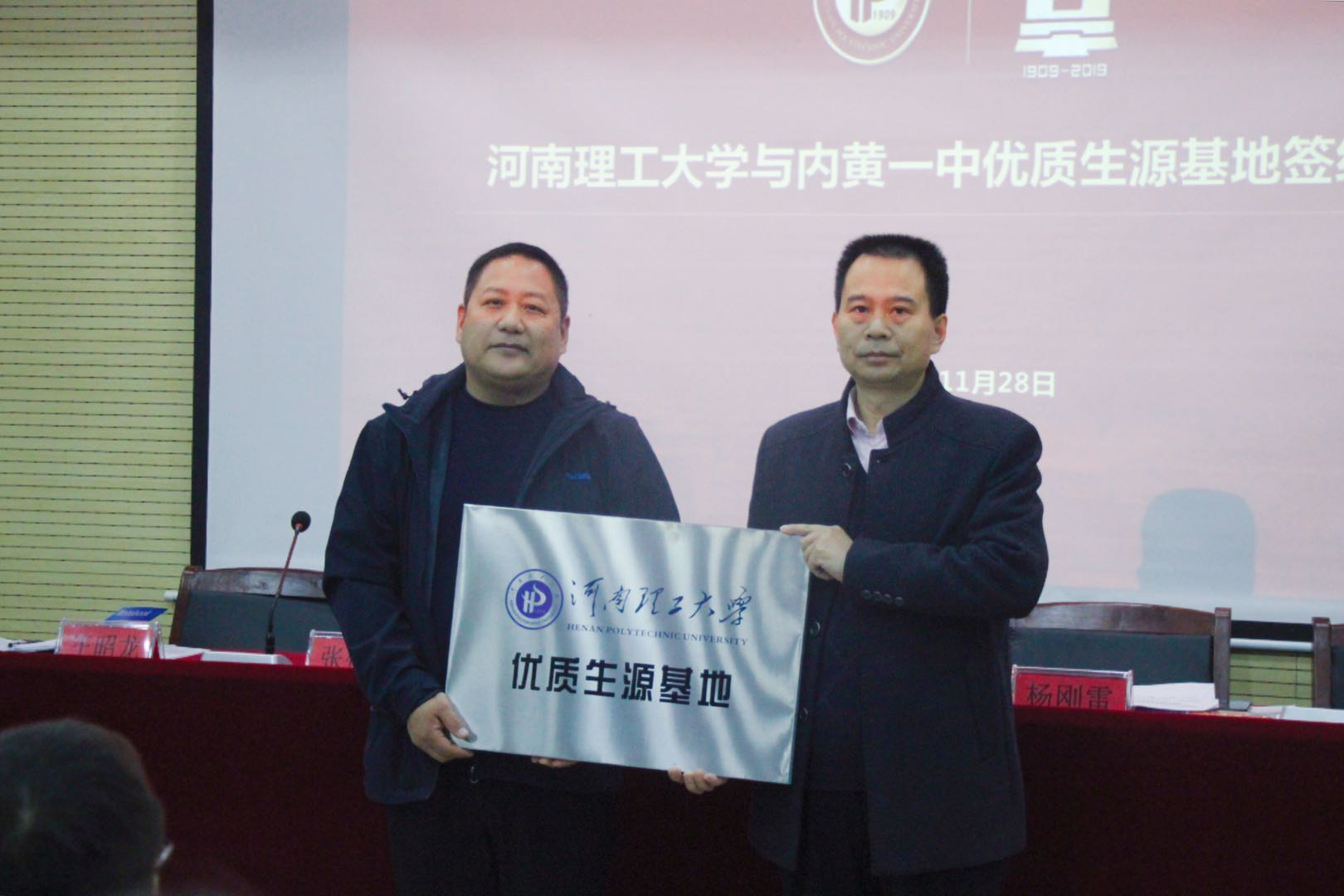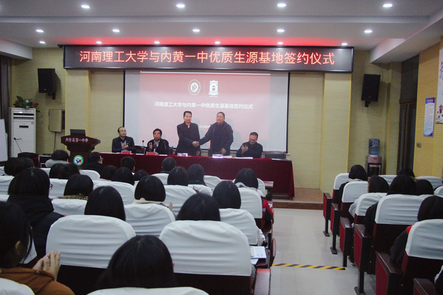 2019年11月28日下午,河南理工大学优质生源基地签约授牌仪式在内黄一中办公楼一楼报告厅举行。河南理工大学法律事务办公室主任兼校办副主任张付领,材料学院党委副书记张建新,材料学院学工办主任王昭龙一行3人,内黄一中校长杨刚雷、教导处主任郭瑞增及高二部分师生参加了签约授牌仪式。