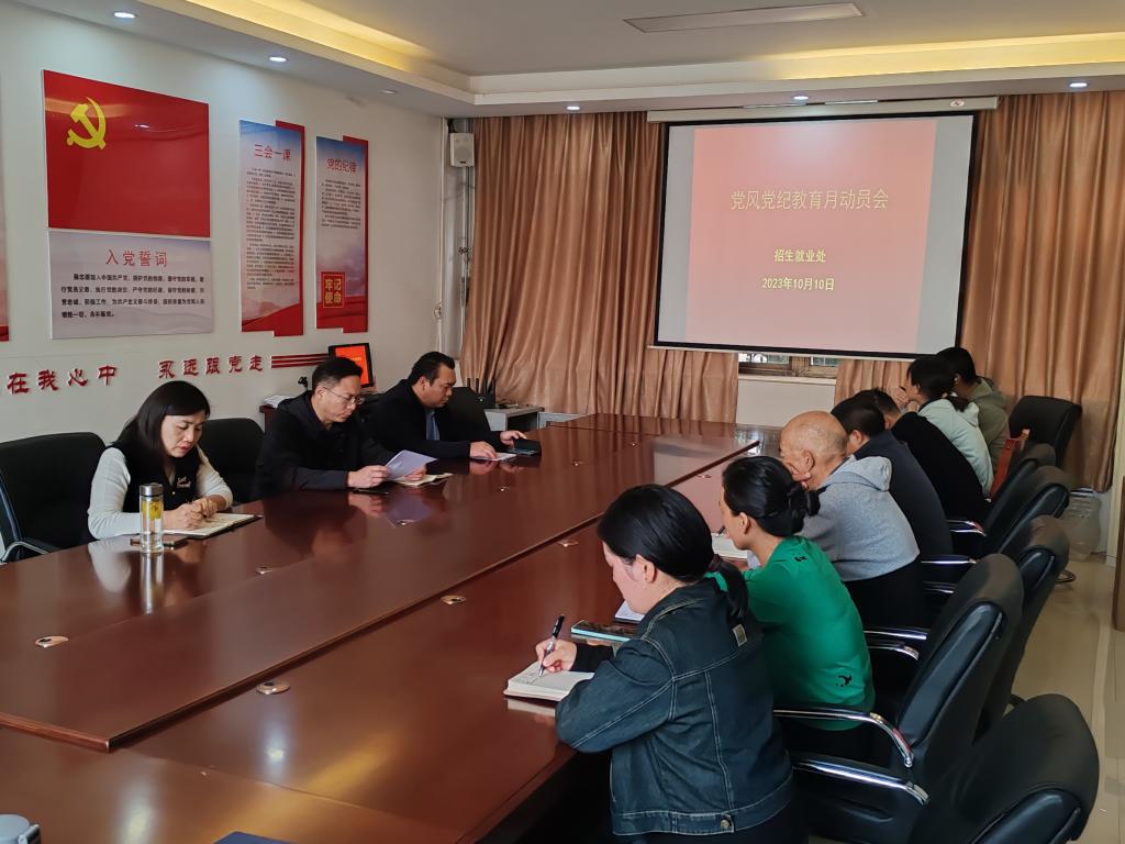 为贯彻落实校纪委及机关党委关于开展2023年党风党纪教育月活动的各项安排部署,10月10日上午,招生就业处在大学生活动中心104室召开了2023年党风党纪教育月活动动员会。会议由处长张光胜主持,处领导班子成员和各科室教师参加会议。