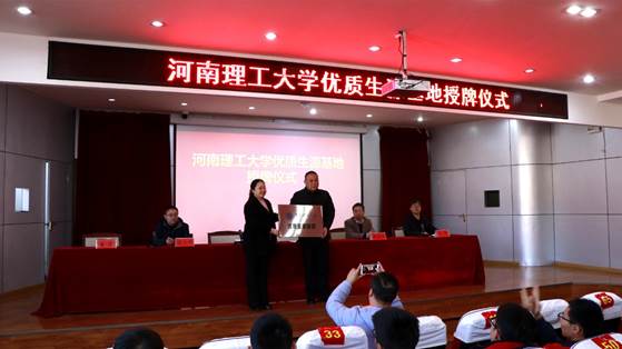 为进一步贯彻落实学校招生政策,切实提升本科生生源质量,进一步加强优质生源基地建设,11月26日上午,河南理工大学与长垣市第一中学共建“优质生源基地”揭牌仪式在长垣市第一中学举行。河南理工大学应急管理学院党委书记谢玉芬、副院长揣小明、应急技术与管理专业系主任钱洪伟、2021级专职辅导员海波,长垣一中校长徐永立、副校长李明等学校领导相关科室工作人员、部分师生代表参加仪式,仪式由长垣一中副校长李明主持。